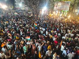 इंदौर|टी-20 वर्ल्ड कप फाइनल में भारत की जीत के बाद शहर में जश्न का माहौल बन गया। बड़ी संख्या में लोग जश्न मनाने के लिए राजबाड़ा पहुंचने लगे। भीड़ बढ़ने पर पुलिस ने सुरक्षा व्यवस्था के तहत बैरिकेड लगाकर लोगों को रोकने की कोशिश की, जिससे कुछ लोग नाराज हो गए और वहां धक्का-मुक्की की स्थिति बन गई।