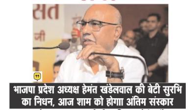 भाजपा प्रदेश अध्यक्ष हेमंत खंडेलवाल की बेटी का निधन, पार्टी में शोक