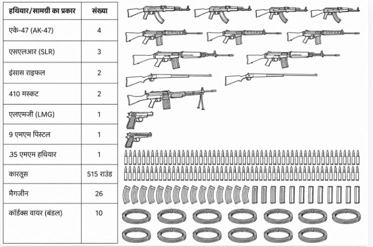 आत्मसमर्पण के साथ ही इन नक्सलियों ने पुलिस को 32 आधुनिक हथियार और भारी मात्रा में गोला-बारूद भी सौंपे हैं। बरामद हथियारों और सामग्रियों का विवरण इस प्रकार है: